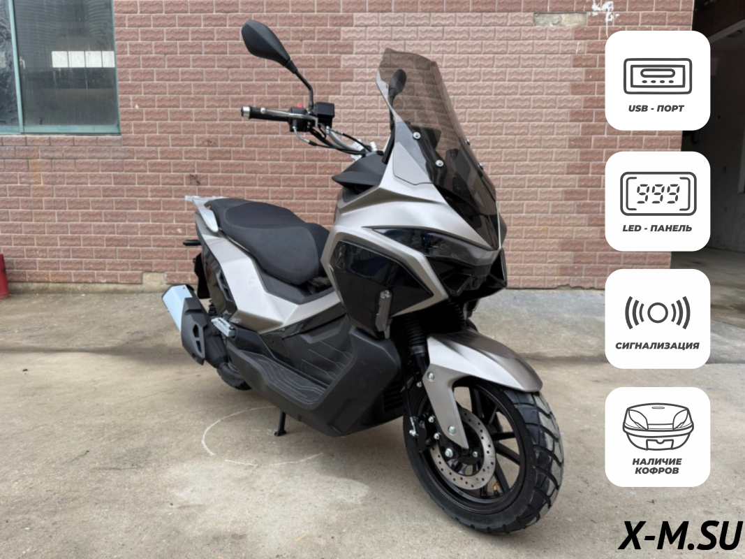 Каждая поездка – путешествие! Мощный мотор, который с легкостью справится с райдером, пассажиром и грузом! 13 радиус колес уверенно держит скутер на асфальте и грунте. Так же, благодаря колесам, хороший дорожный просвет позволяет комфортно преодолевать неровности дорожного покрытия! Широкое и комфортное сиденье для райдера и пассажира. Яркая LED оптика с линзами гарантирует достаточное освещение в темное время суток.